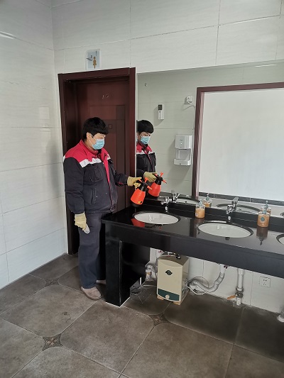在疫情期间,公司每天安排人员对食堂、厕所、楼道等进行喷雾消毒,并填写消毒登记表。